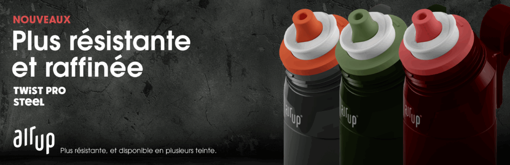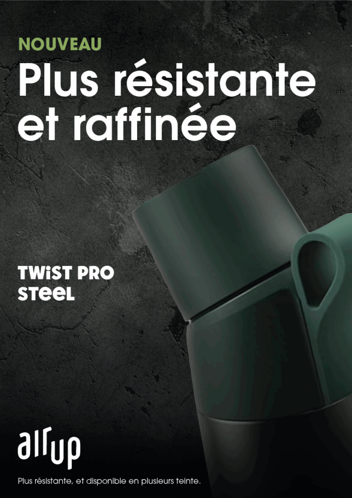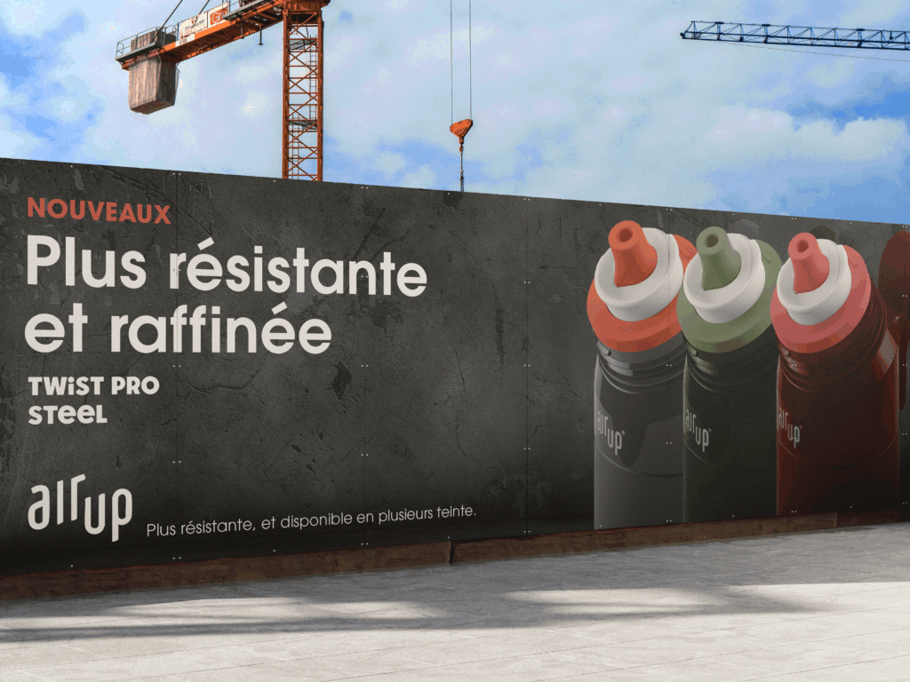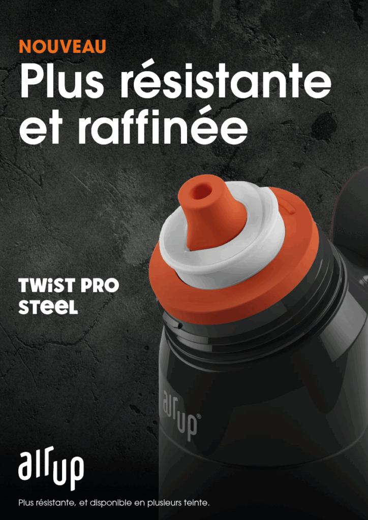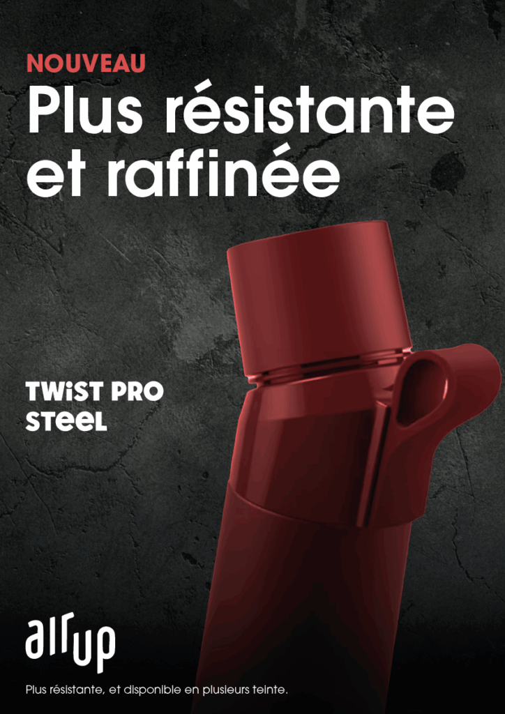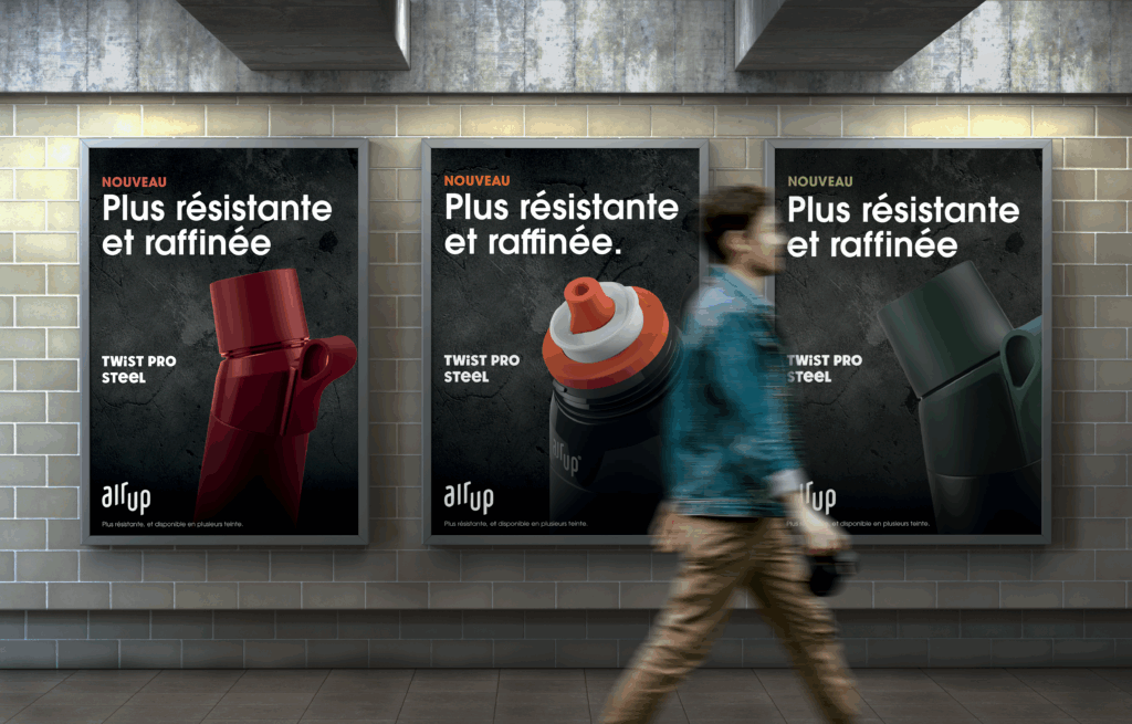 Air up Création d’une campagne d’affiches pour la sortie des nouvelles gourdes Air Up® Twist Pro Steel.Air Up fait passer sa gourde la plus populaire au niveau supérieur : acier inoxydable durable, finition mate élégante et double paroi isolante.