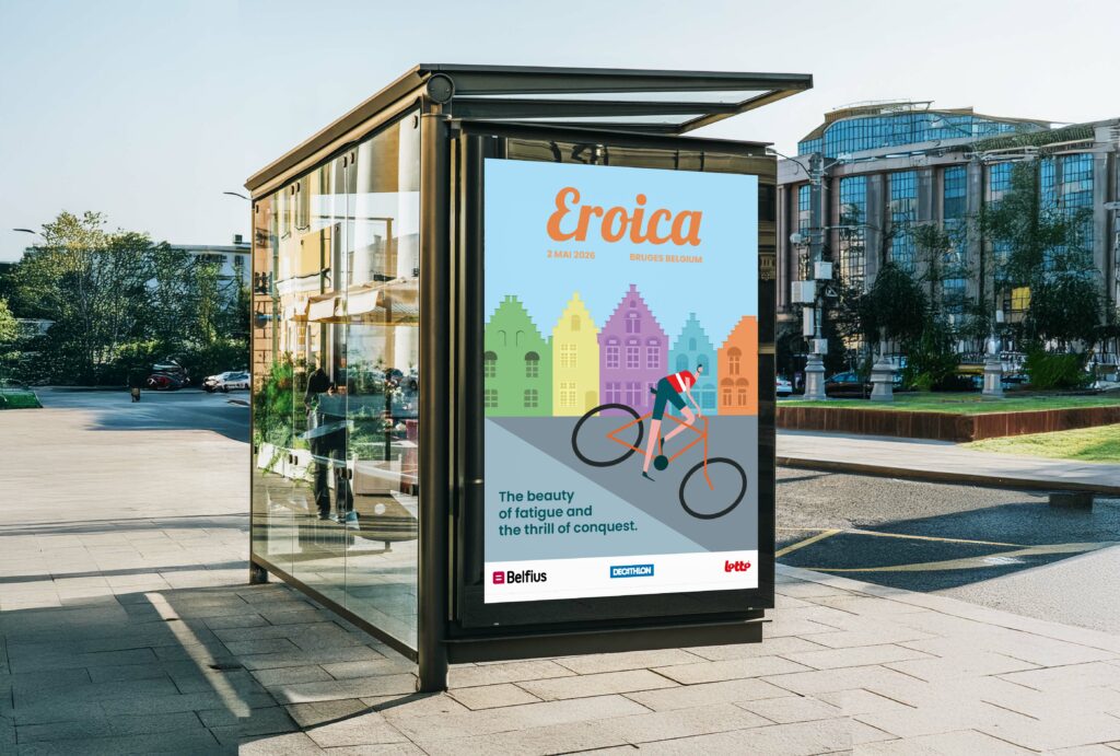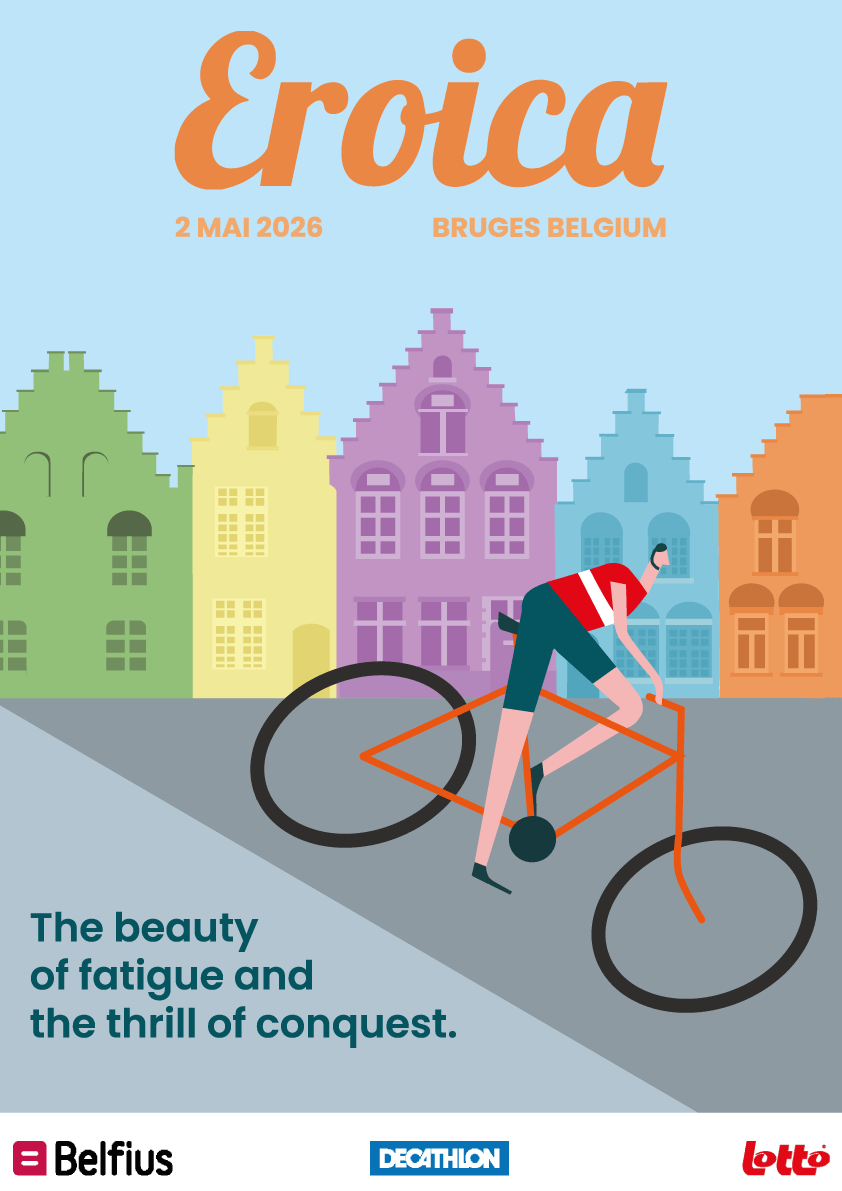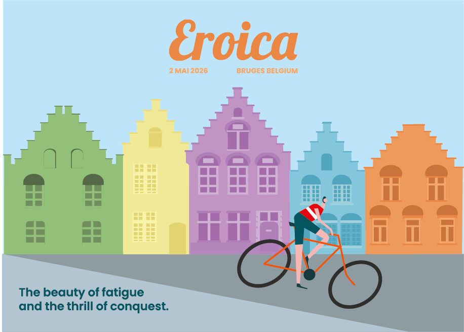 Eroica Création et mise en page d’une affiche et d’une carte postale pour une course cyclotouristique : l’Eroica. L’Eroica est une course de vélos à l’ancienne qui a vu le jour en Toscane en 1997. La Belgique organise sa première édition en 2026.